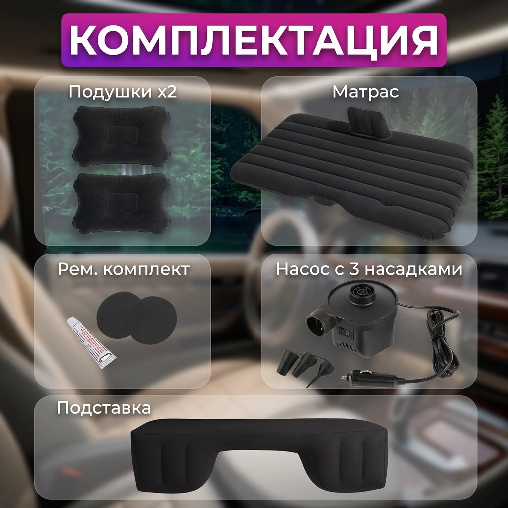 В комплекте — насос от прикуривателя (12V), две подушки и ремонтный набор. Надувание занимает всего пару минут: подключил, нажал кнопку, и спальное место готово. Складывается компактно, не занимает места в багажнике.